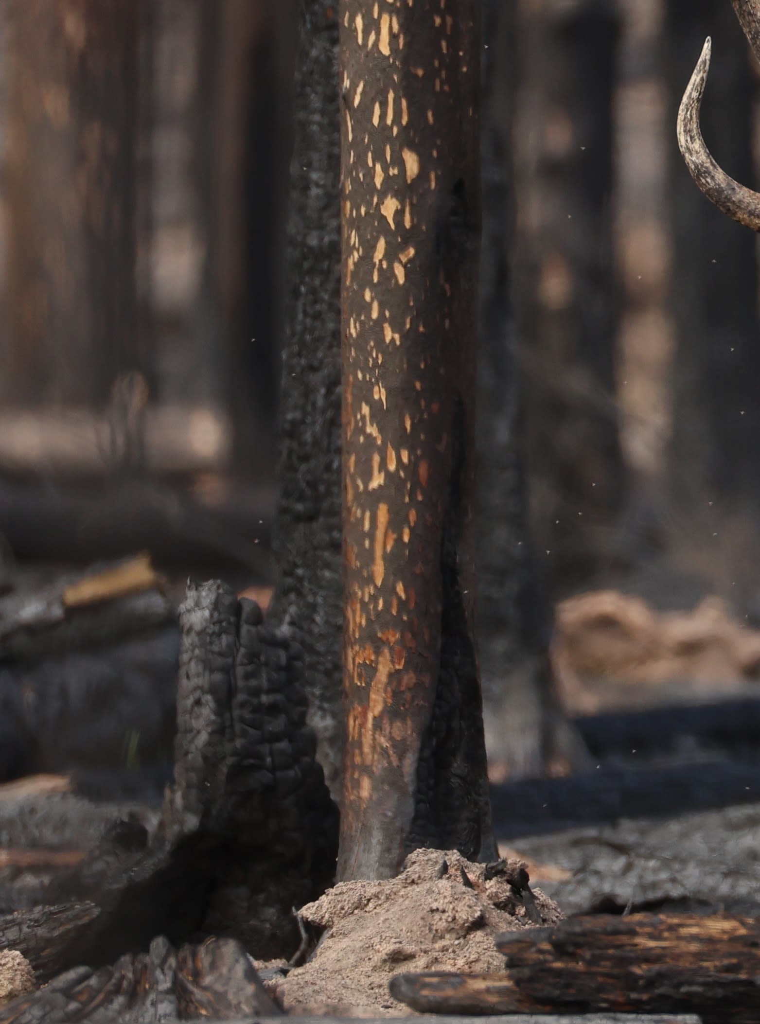 Most strikingly on the blackened horizon are the spotted snags, the standing dead trees with very distinctive contrasting spots — locals are calling them leopard trees. This happens, Marcia says, when the intense heat causes the sapwood to lose moisture, contract and pop off during the fire. Wind may also be a factor, blowing loosened bark and debris away and creating these spot patterns.