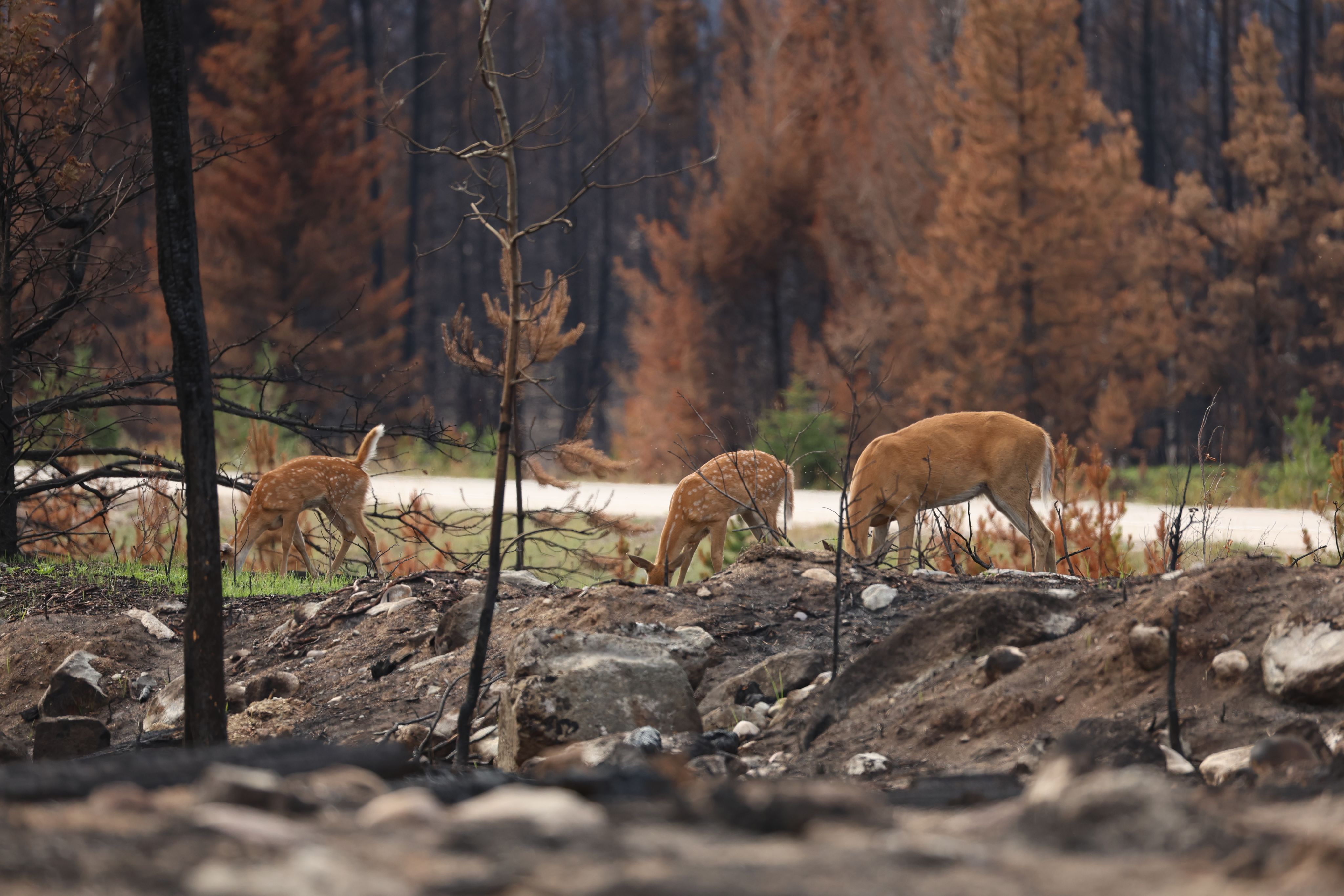 Signs of regrowth are already visible in charred areas. Trembling aspens are sending up new shoots while fire-adapted species, such as fireweed, wild strawberry and willows, add colour to the blackened landscape.