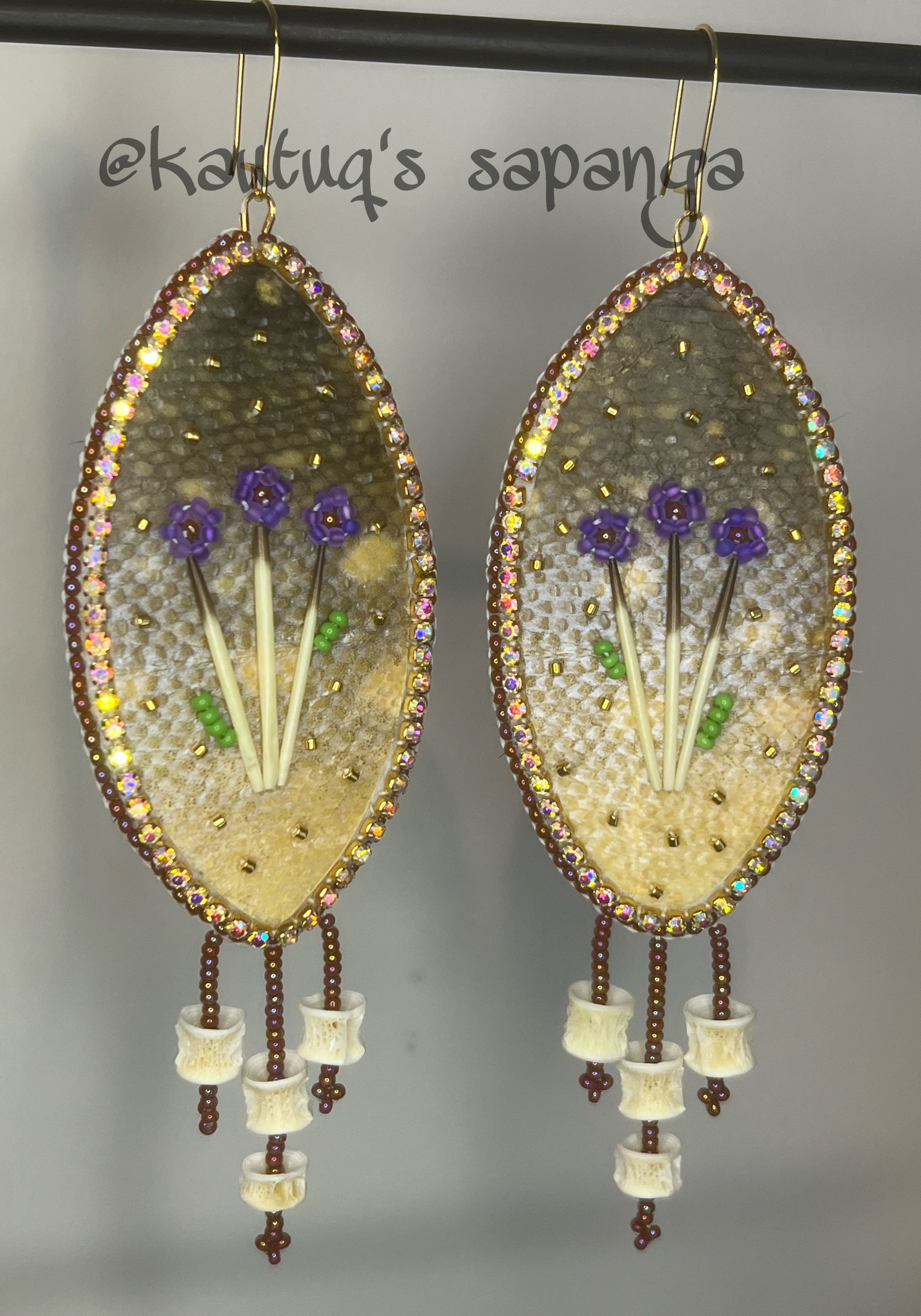 These earrings were created as a collaboration with another artist, Tegan (the Littlest Inukshuk). They are made using beads, dentalium shells and fish vertebrae.
