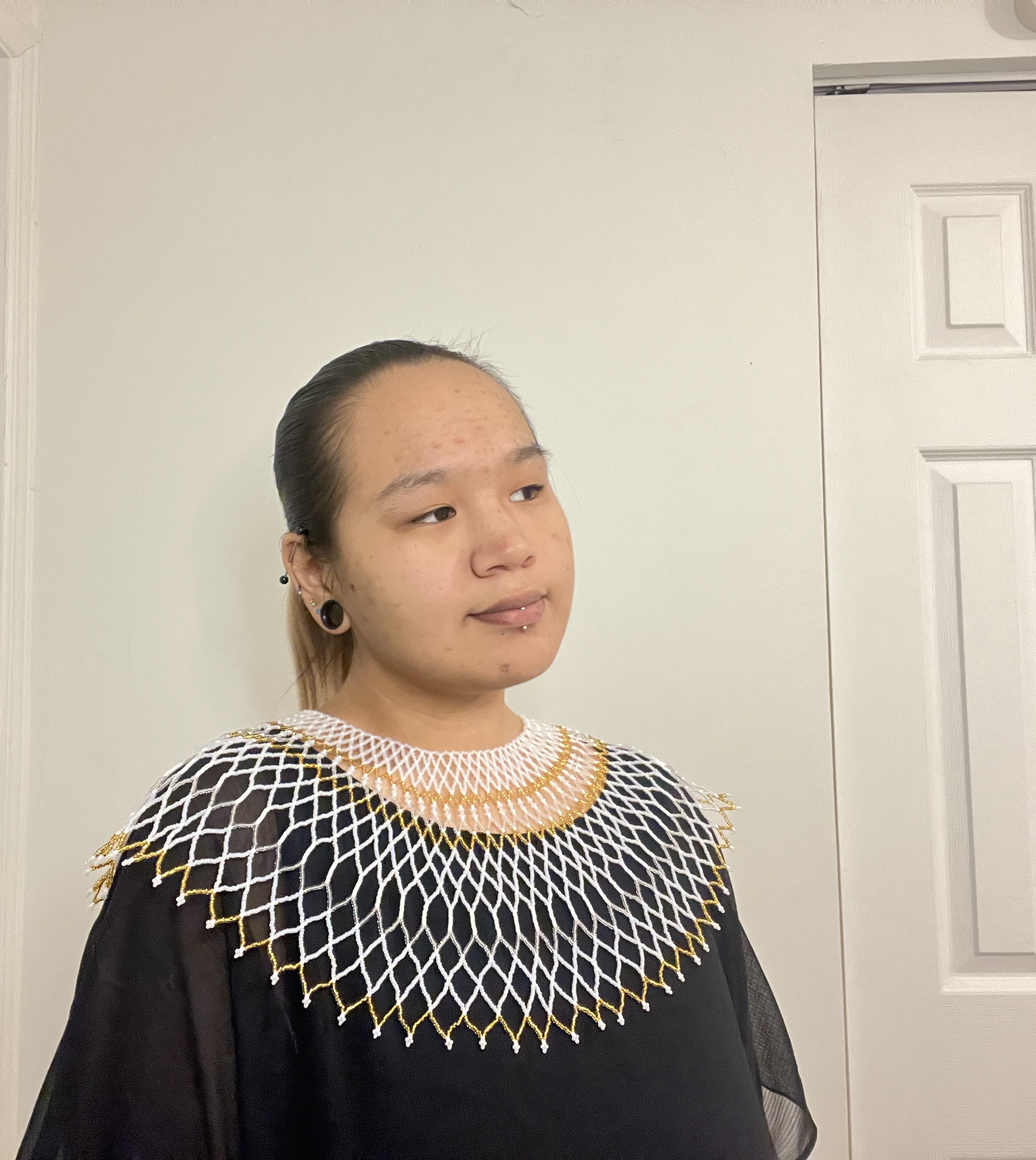 Kautuq modelling a beaded necklace she created for a client. "She is planning to wear it for her wedding," Kautuq says.