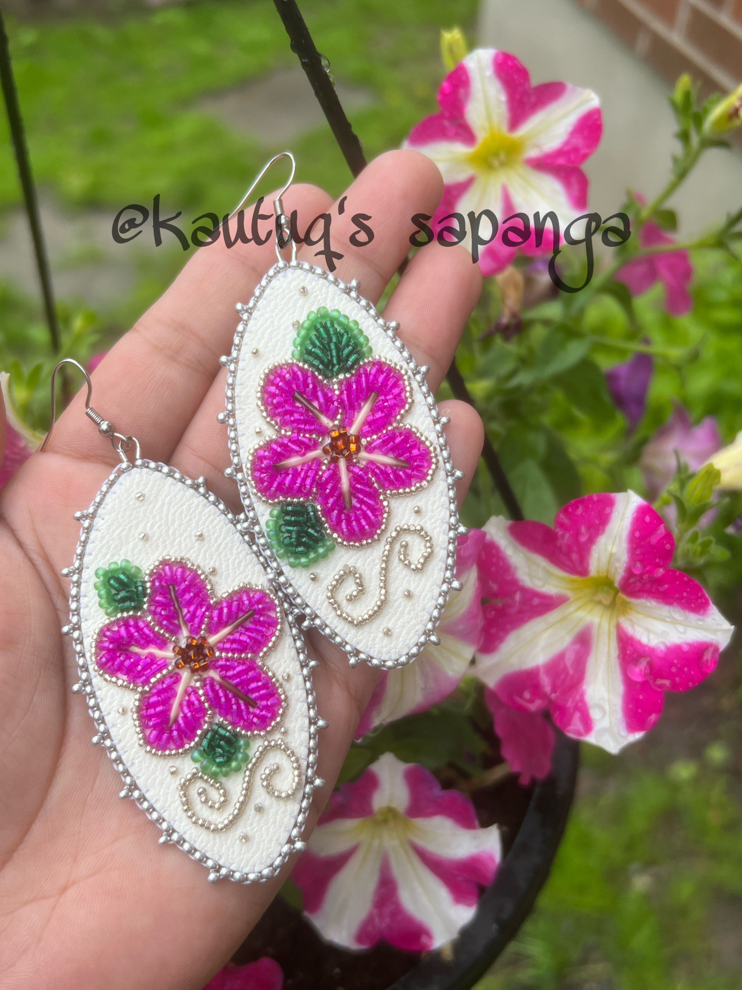 These floral earrings are made with naluaq, various sized beads and a holographic backing.