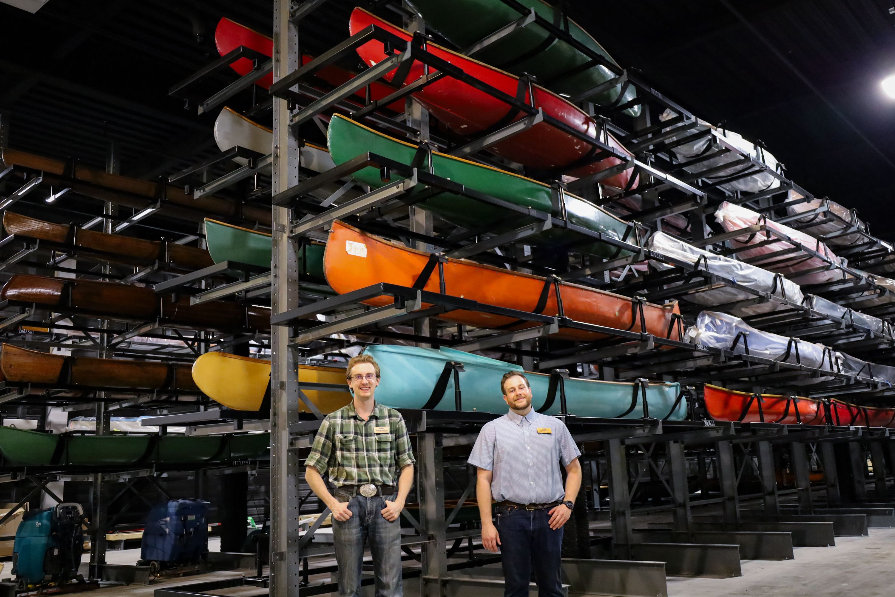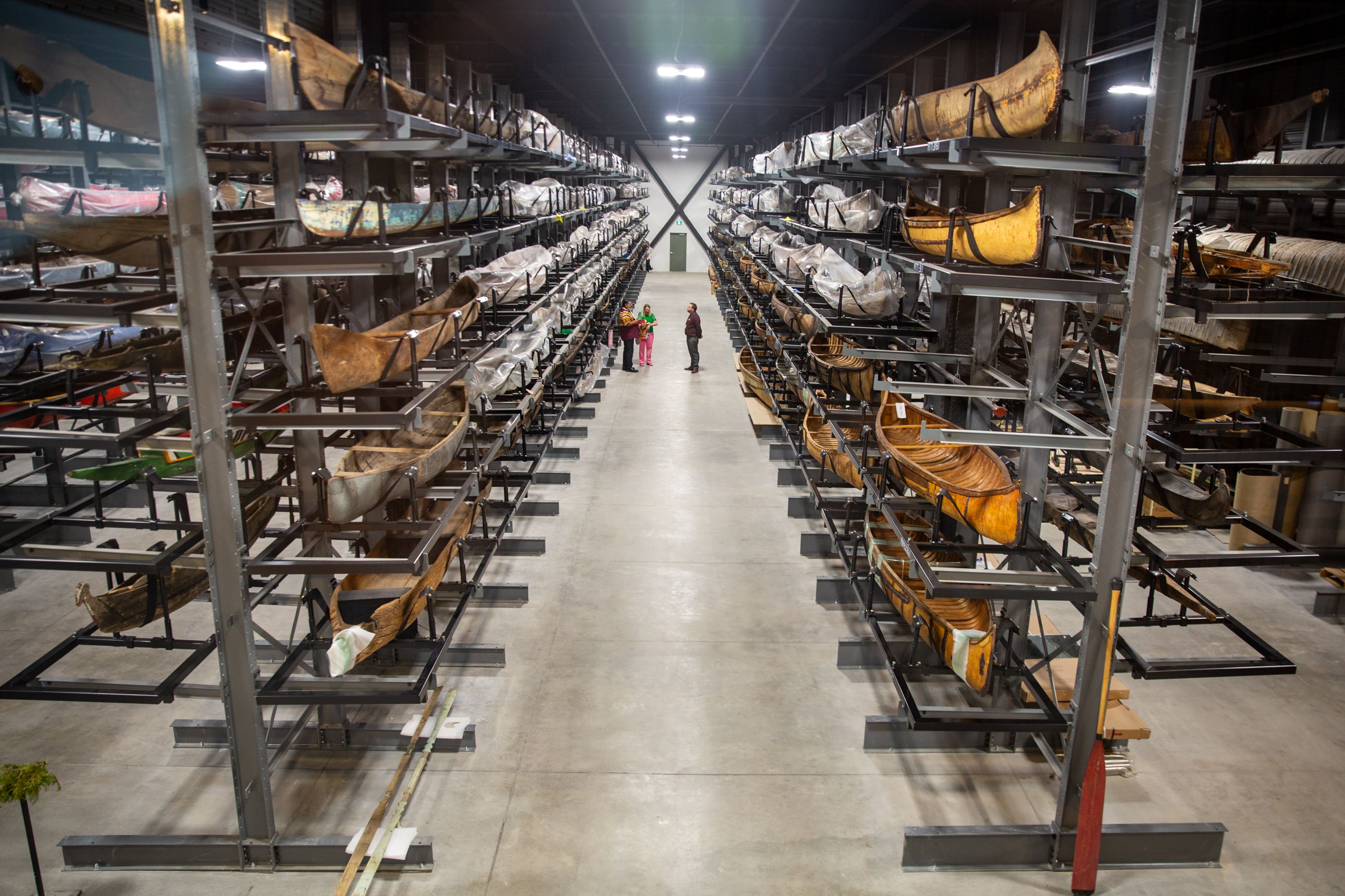 Stacked in a specially made racking system are hundreds of canoes and kayaks, many from Indigenous communities and all, in some way, inspired by the traditional watercraft of the First Nations and Inuit.