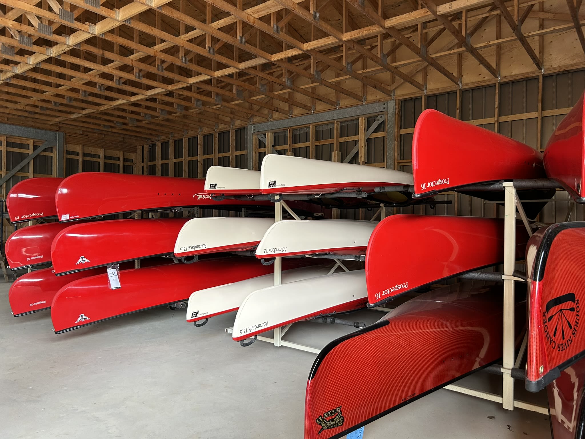 Canoes are grouped by construction type. Dugout canoes, some more than two hundred years old, live together in an aisle; birchbark canoes make up another aisle and a half, and so on.