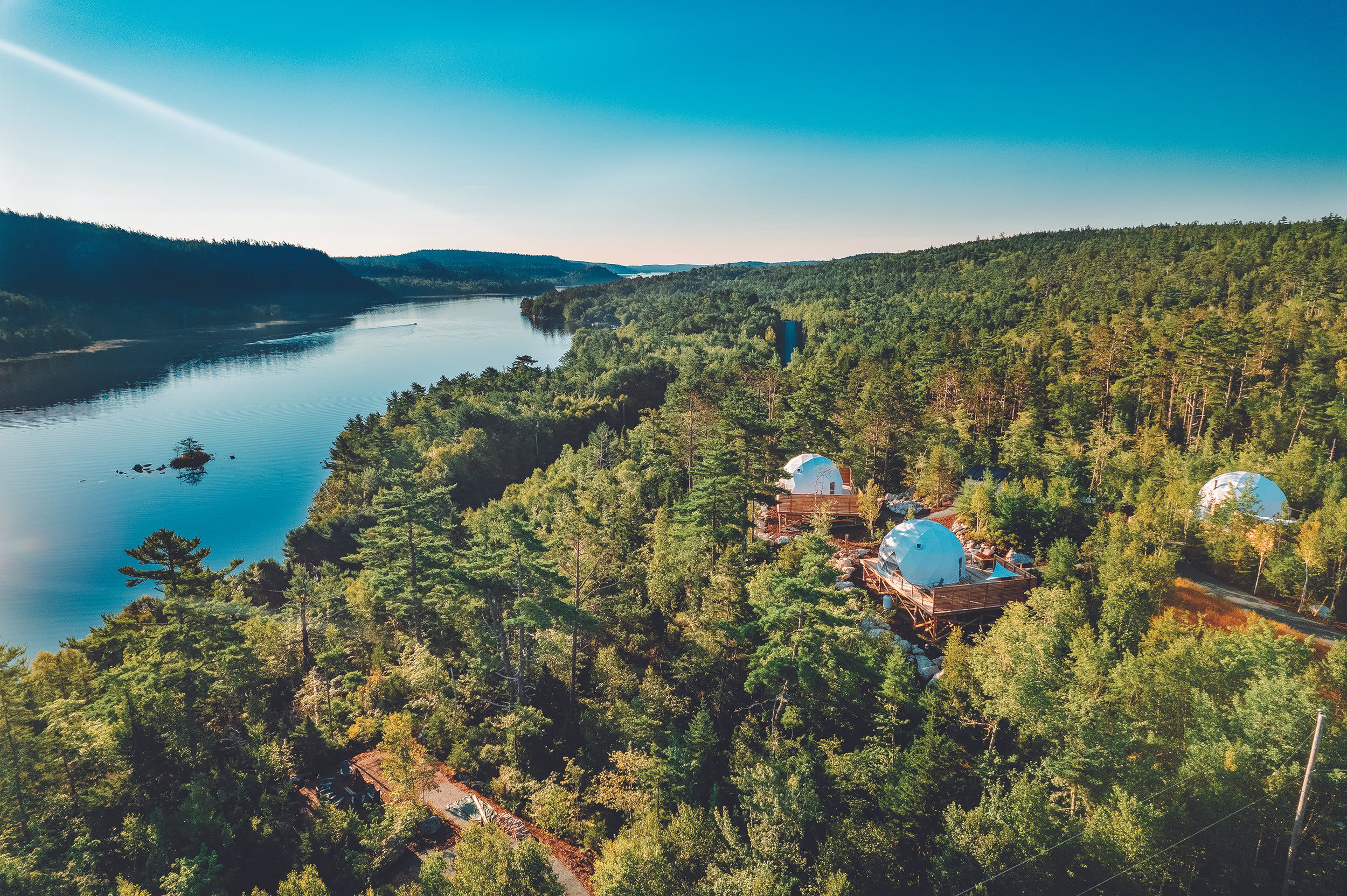 Set deep in Nova Scotia wilderness, the retreat’s geodesic (eco-friendly) domes sit among the trees, their curved forms designed to integrate into the surrounding forest.