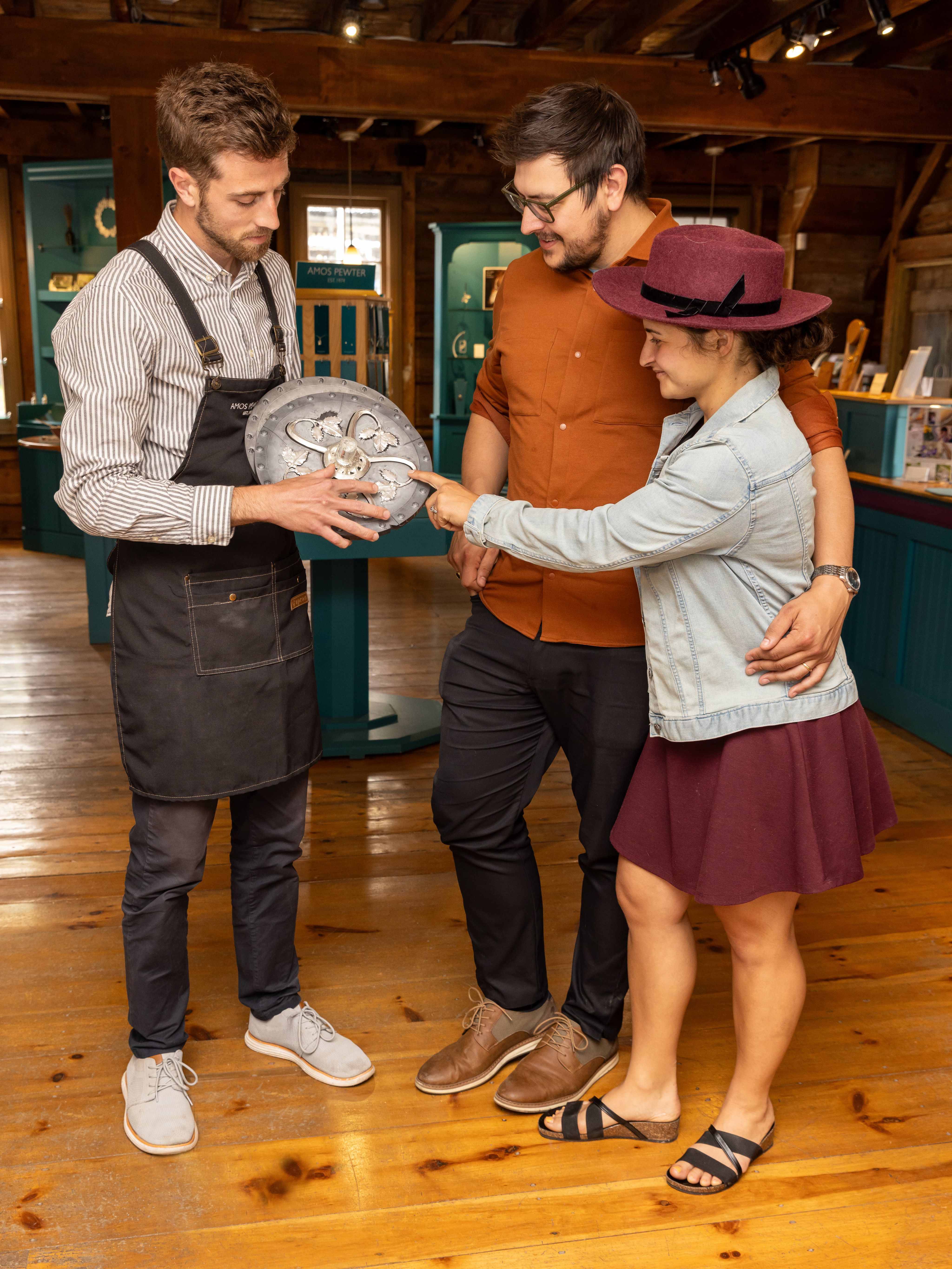 Dans les ateliers-boutiques d’Amos Pewter, des démonstrations ont lieu en continu, mais il est aussi possible de créer soi-même une pièce. « On montre le moulage. Les personnes participantes font la finition et peuvent ramener leur pièce à la maison. »