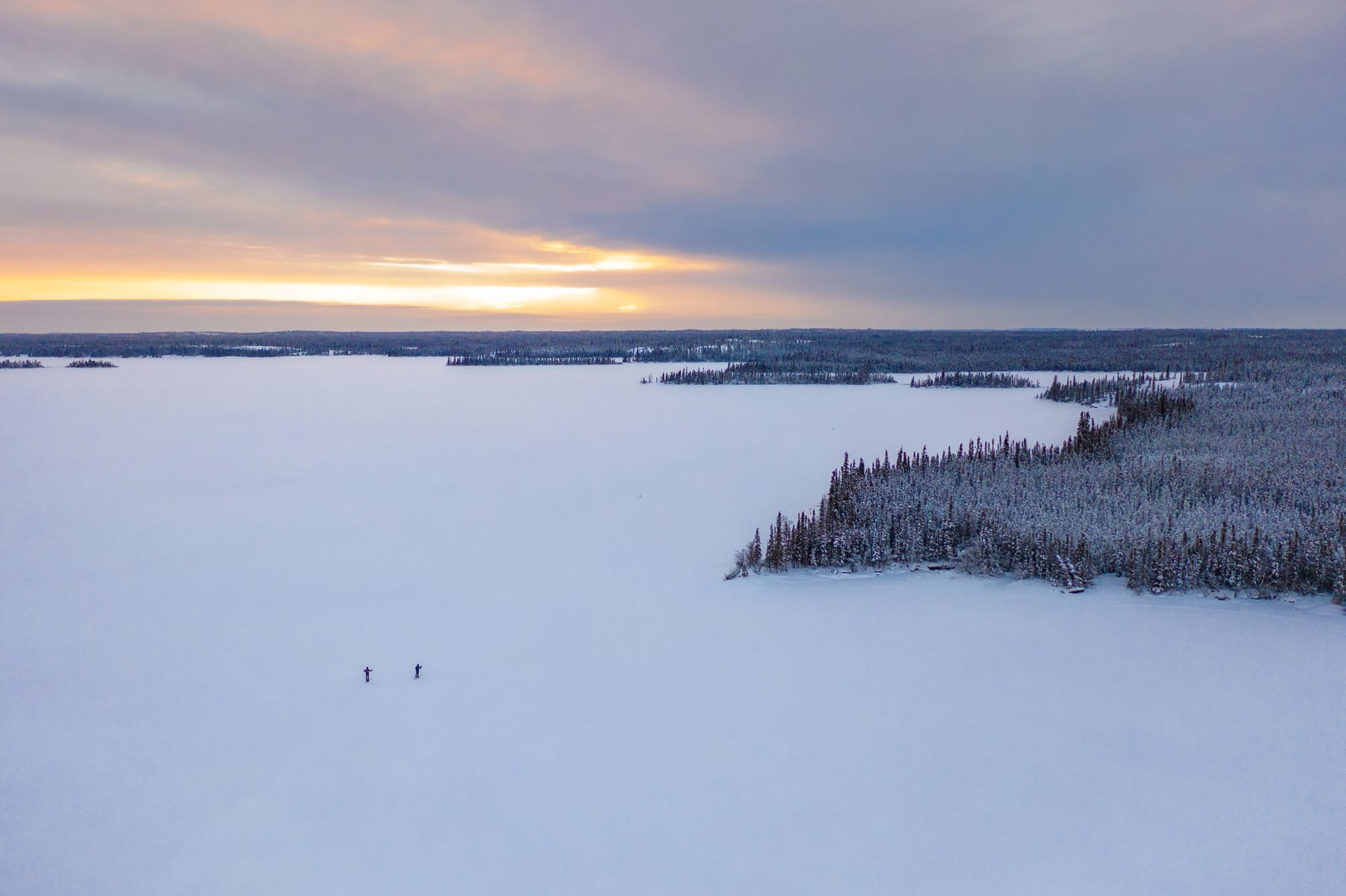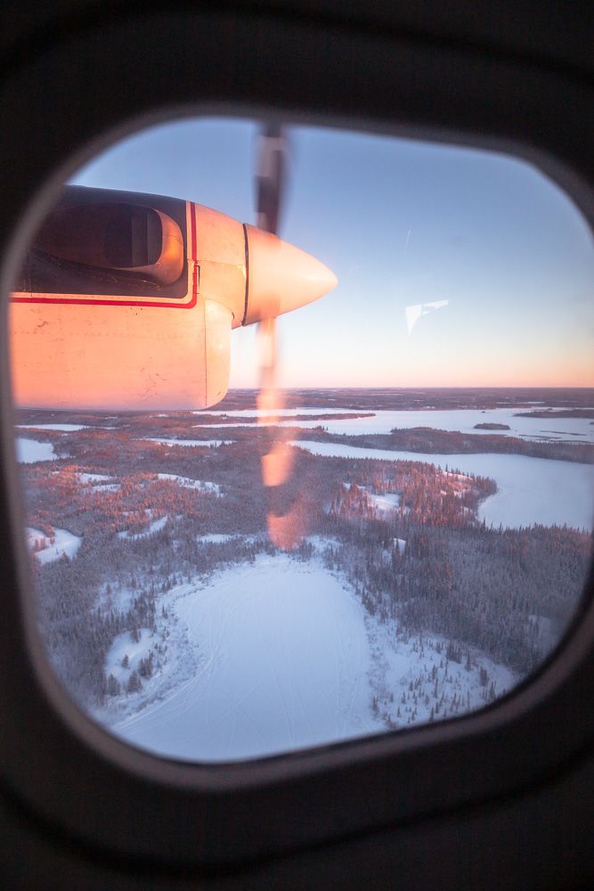 The flight is only about twenty-five minutes, but it carries you over a sweep of winter wilderness that feels impossibly vast: frozen rivers stitched through the forest, untouched lakes, and the long white distances that define the subarctic.