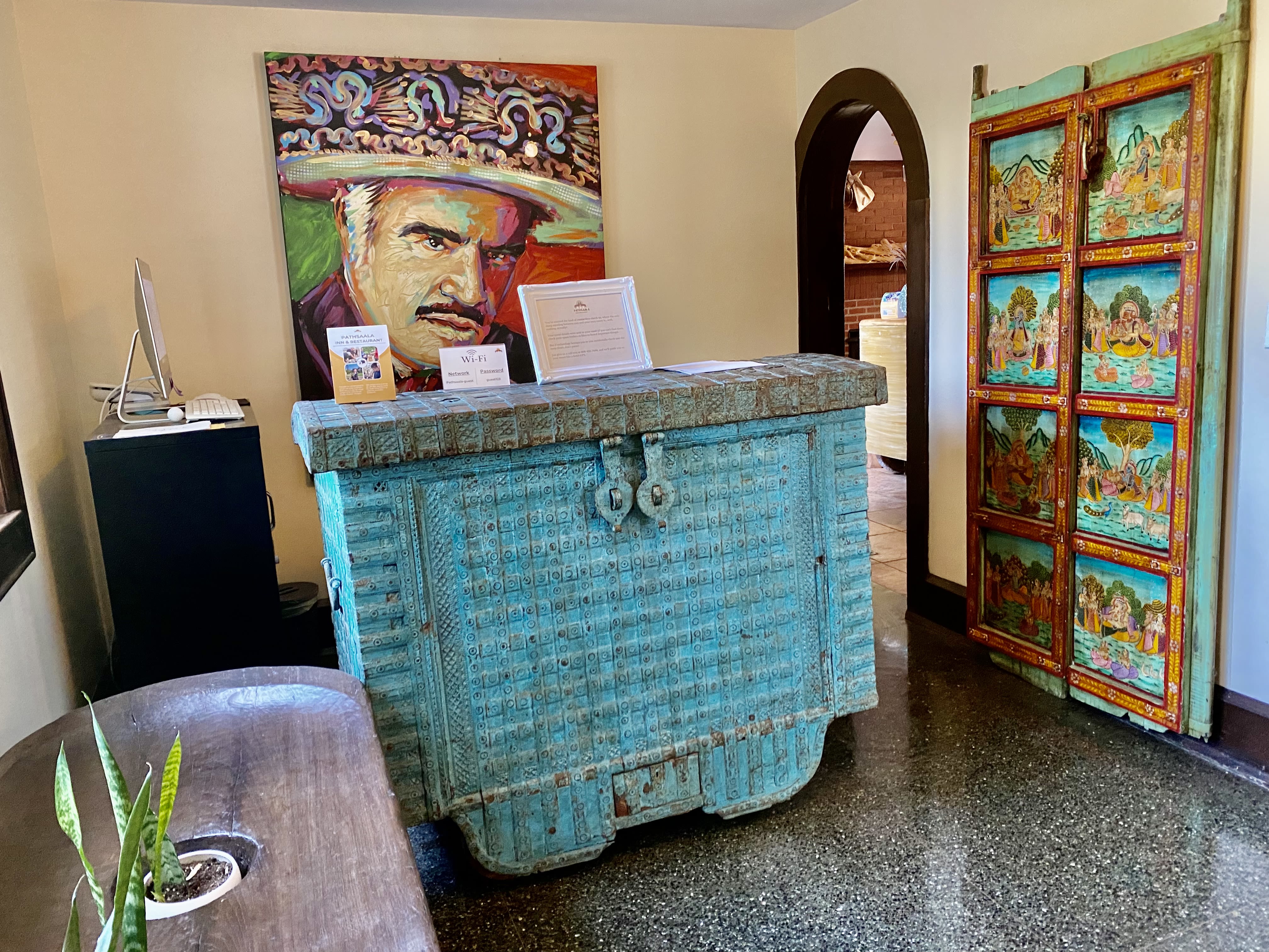 Upon entering Pathsaala Inn & Restaurant, you’ll spy vibrant artwork from around the world. Car-seat sculptures from Nepal, Freida Kalo portraits from Mexico, and heavy, carved doors and furniture from Indonesia.