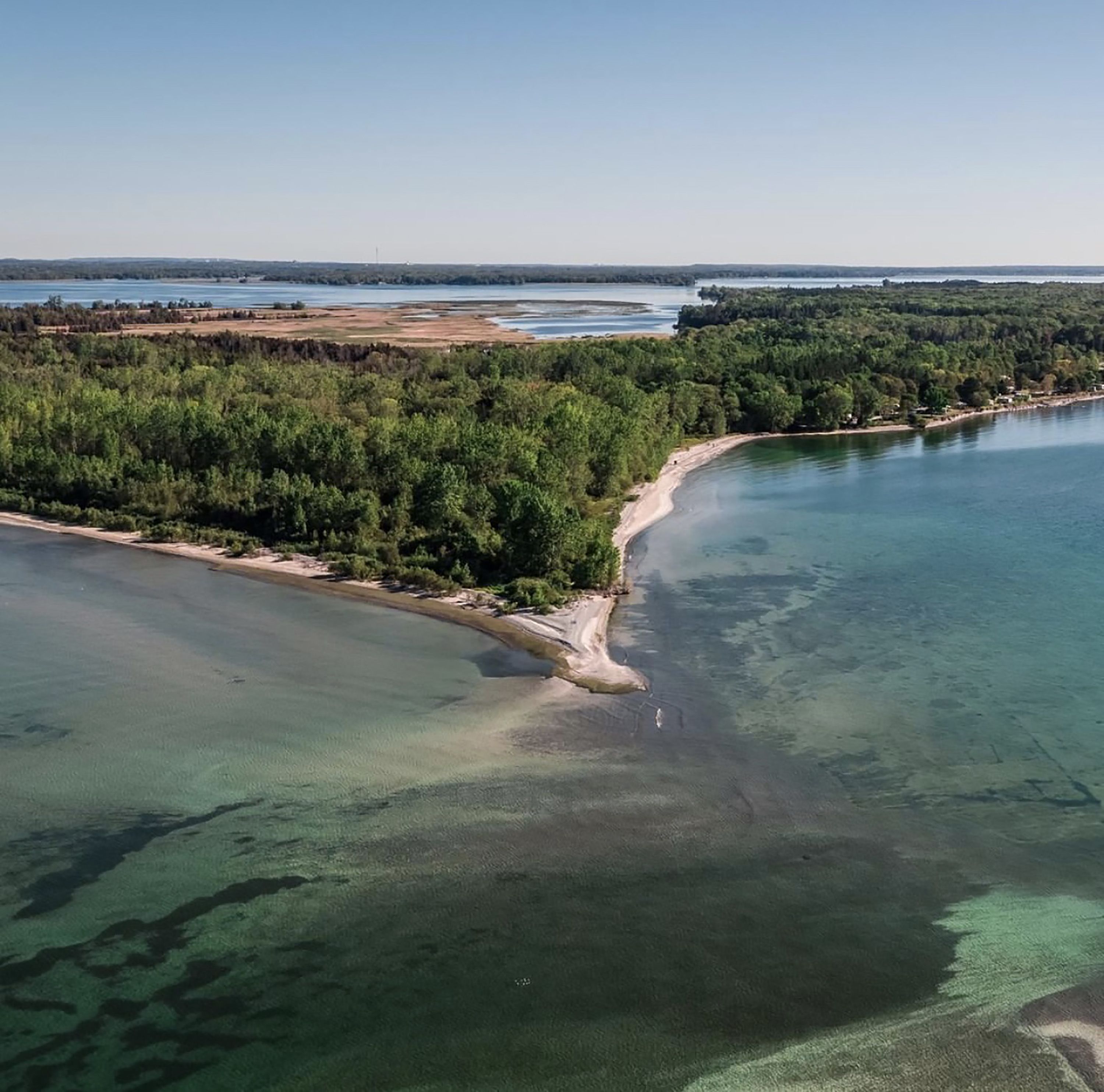 From the point, the sand dunes of Prince Edward County are visible across the water. Beyond them lies the Bay of Quinte — a long, sheltered inlet of Lake Ontario that stretches inland for nearly 100 kilometres in a distinctive zigzag shape. Prince Edward County forms its southern edge; to the north lies the region that shares the bay’s name.