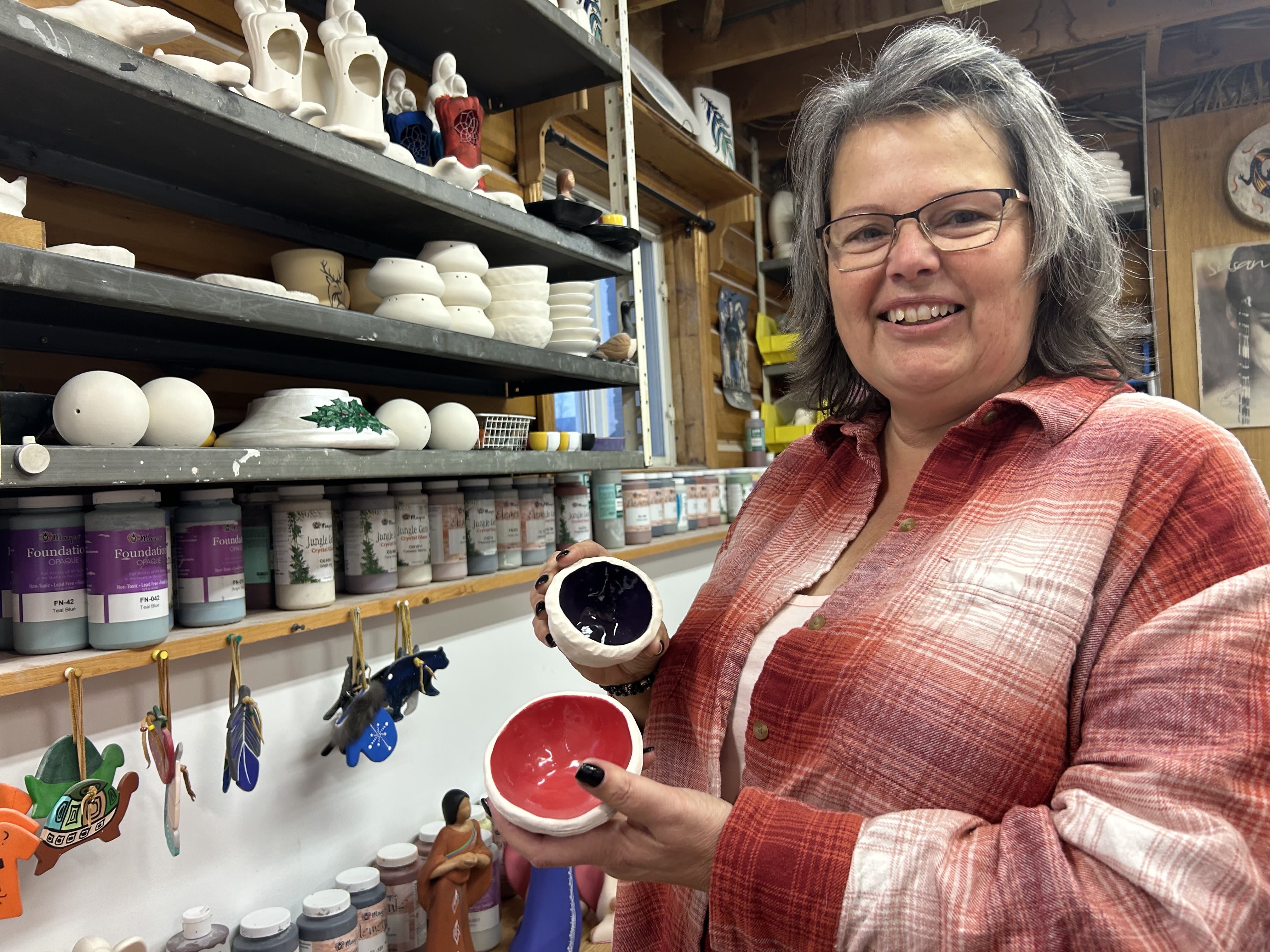 Inside, her home studio opens into a well-stocked art shop and a spacious workshop where she creates her hand-painted ceramics. Shelves are lined with medicine wheels, candle holders, smudge bowls and ornaments in calming earth tones.