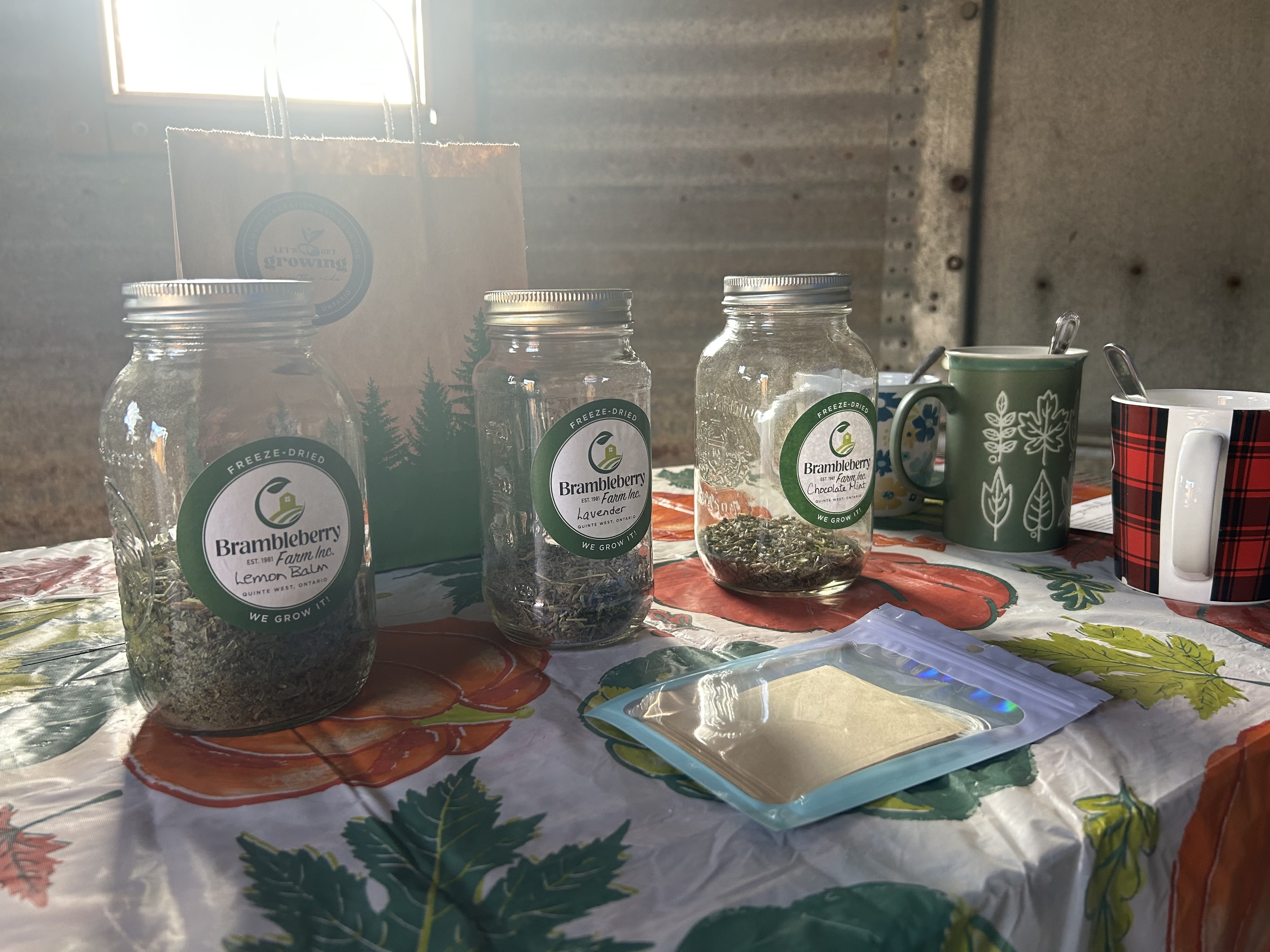 Inside, the table is lined with glass jars of dried herbs and fruit, all grown on the farm. Elaine invites me to mix my own tea. As she sets the kettle to boil, I fill my tea bag with lemon balm, chamomile, a pinch of chocolate mint, and a freeze-dried raspberry. I seal the pouch and drop it into a mug. As Elaine pours the hot water over it, the aroma is amazing.