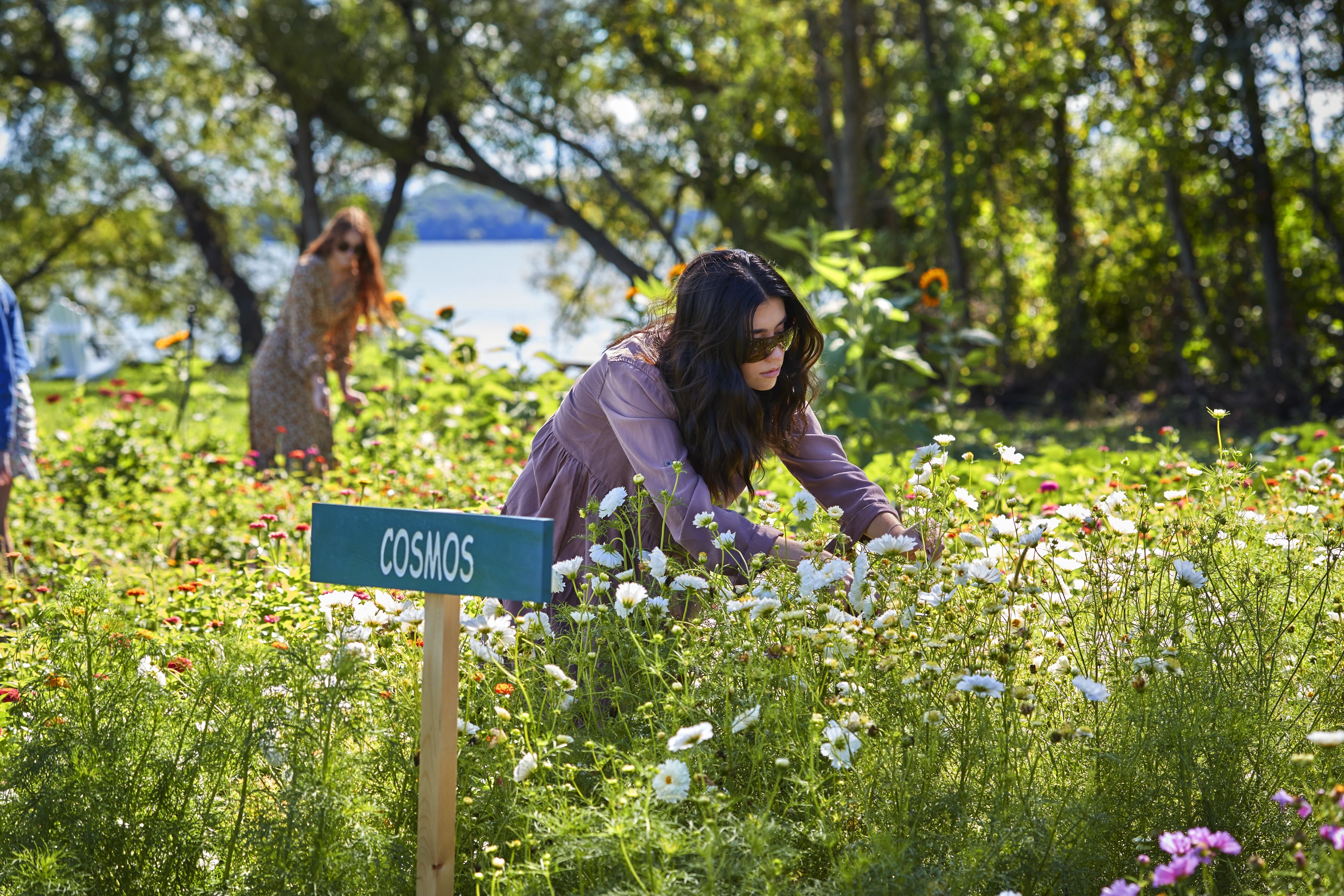 Near the water, flowers ripple in bands of colour. Tall trees offer shade along the shoreline, where guests linger over picnics or ice cream cones, watching the light shift across the water.