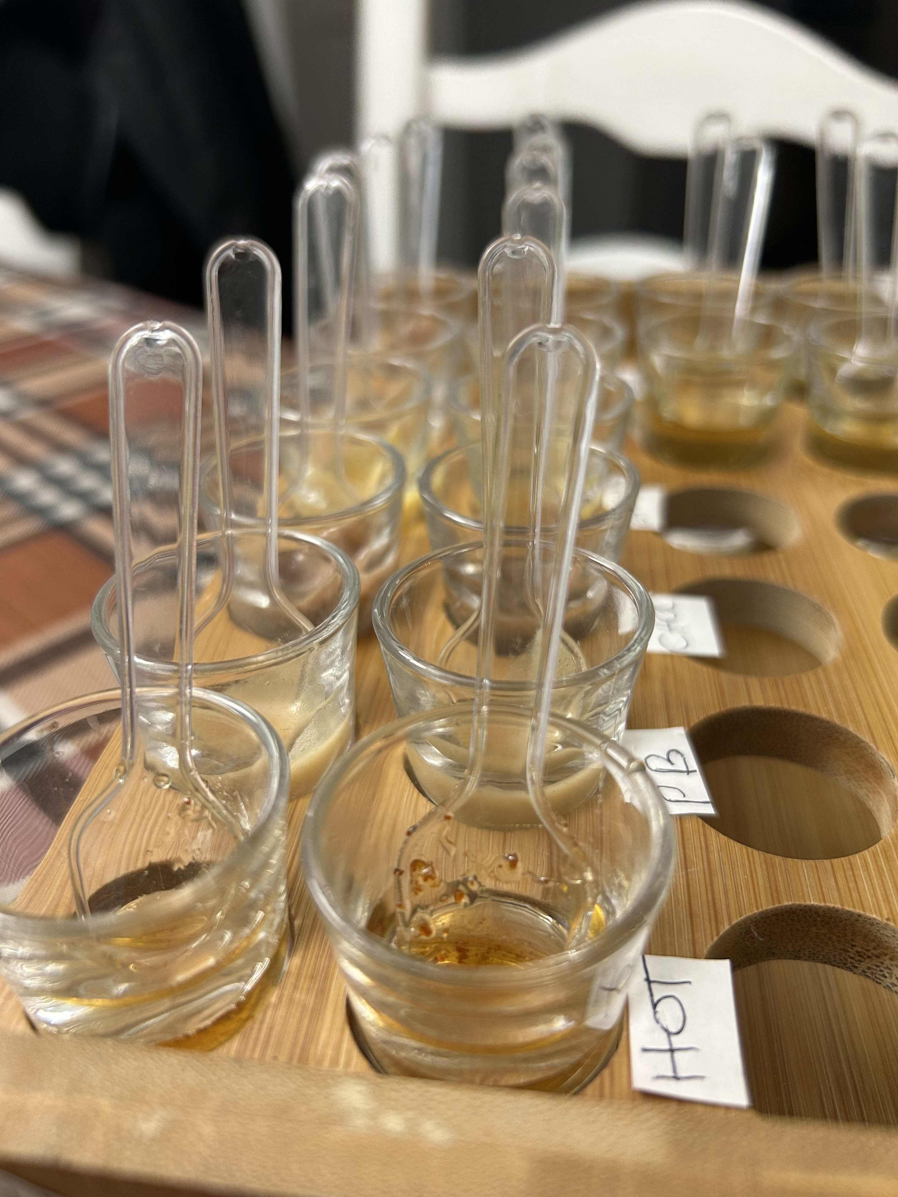 “It’s all raw, unpasteurized honey,” Frances tells me, explaining how each batch is harvested from her apiary. Crisp slices of local apple act as palate cleansers as we move from one tasting to the next, noticing differences in colour, texture, and flavour shaped by what the bees have foraged and Frances has added.