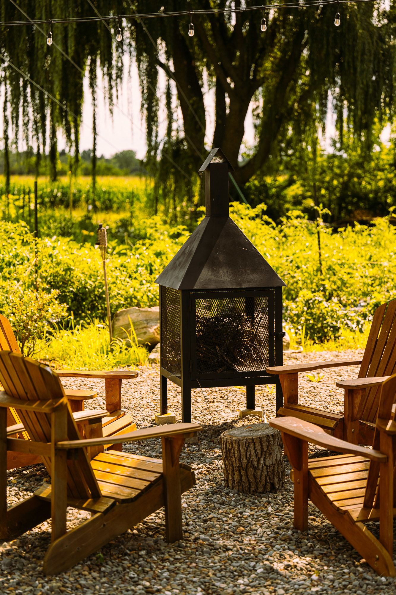 The fireplace, sheltered by the willow, stands right in the middle of the space. One path leads to the chicken coop, another toward the rustic outdoor table.