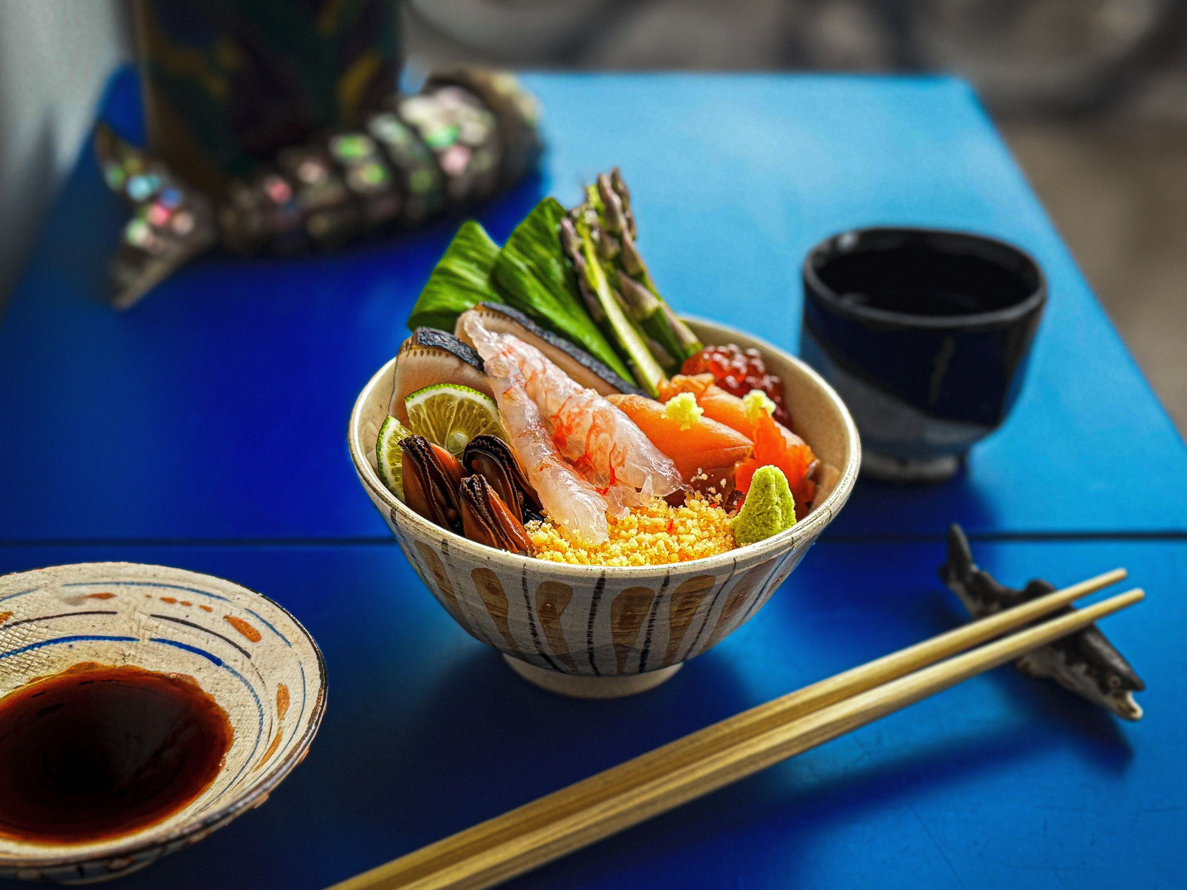 Their lunch and dinner menus lean on what they call “plug-and-play” creativity: subbing local species into classic Japanese preparations.