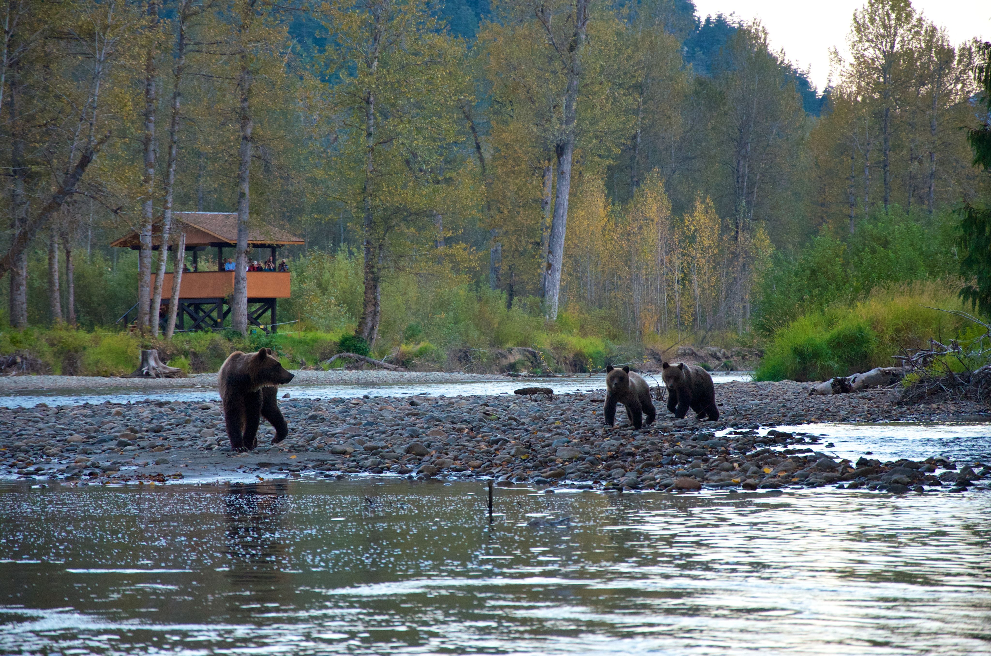 During their migration, they become a primary source of food for grizzly and black bears who are looking to bulk up ahead of their winter hibernation. Bears are impressively in tune with the salmon migration. With astonishing precision, they return to the rivers and streams of western North America to feast on the bounty of fish. This makes autumn in British Columbia an excellent time to see bears along coastal rivers and streams.