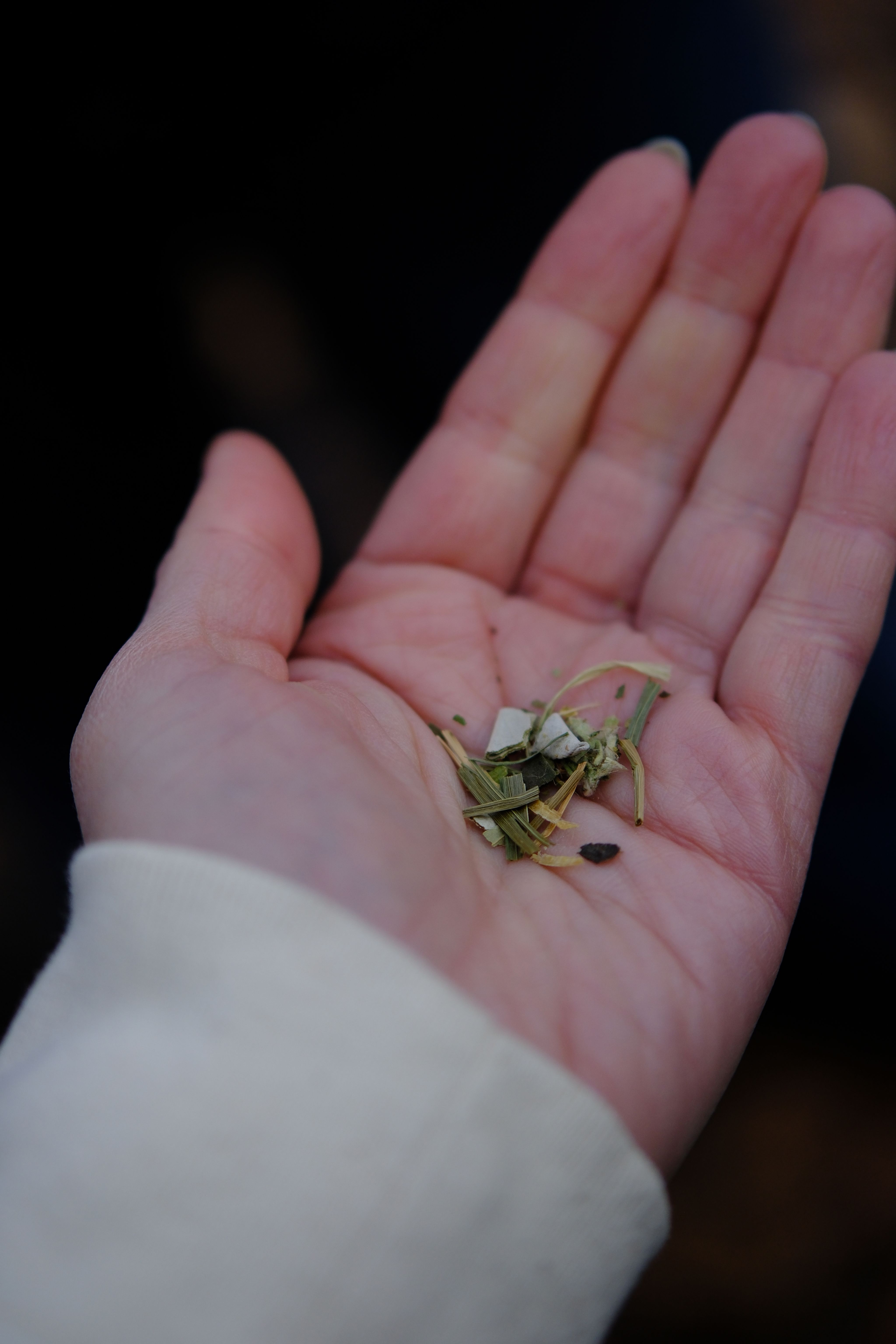 Before we set out, Cecelia asks us to each choose a part of the forest to offer our tobacco. I choose the earth by placing my share of tobacco gently on the frosted ground.