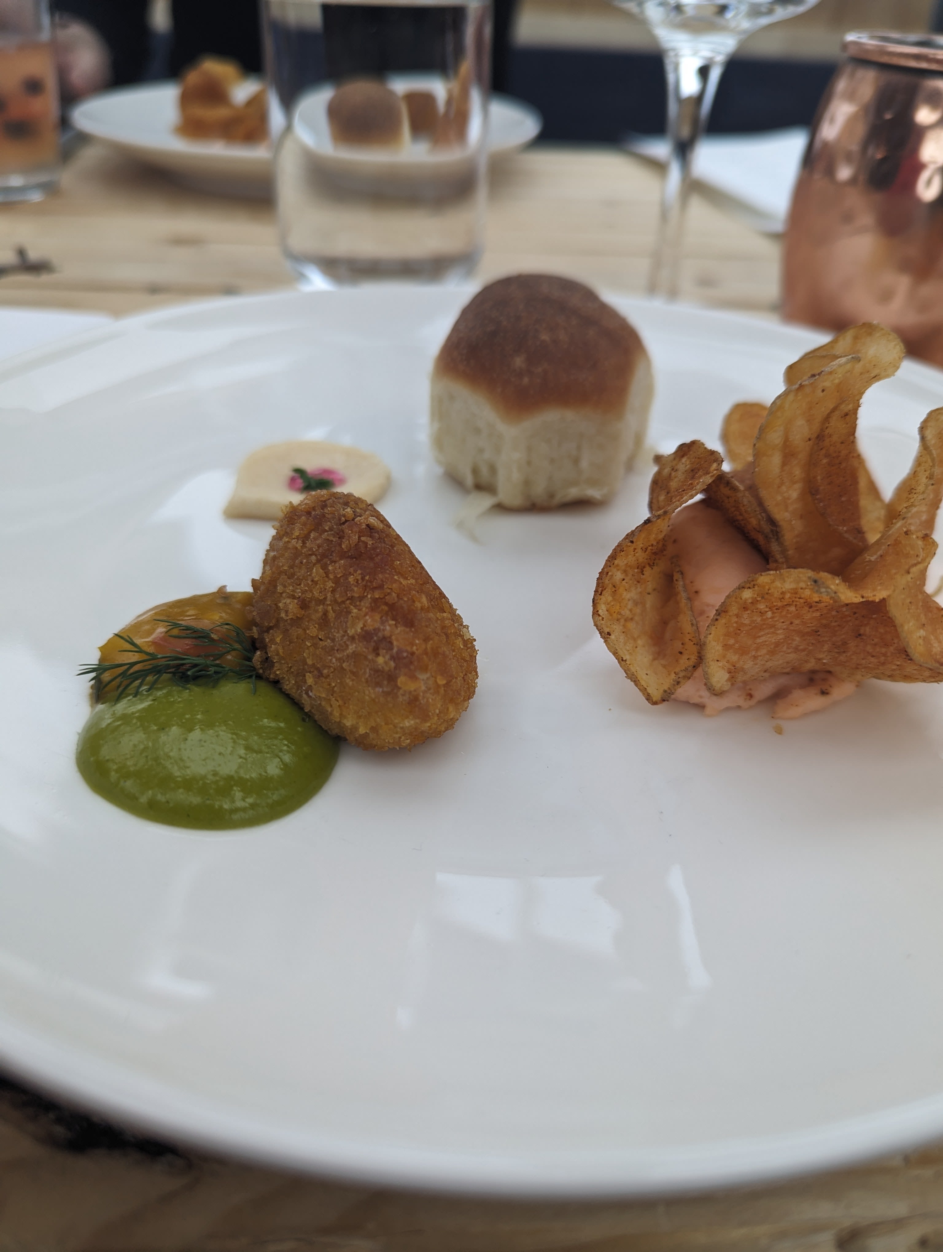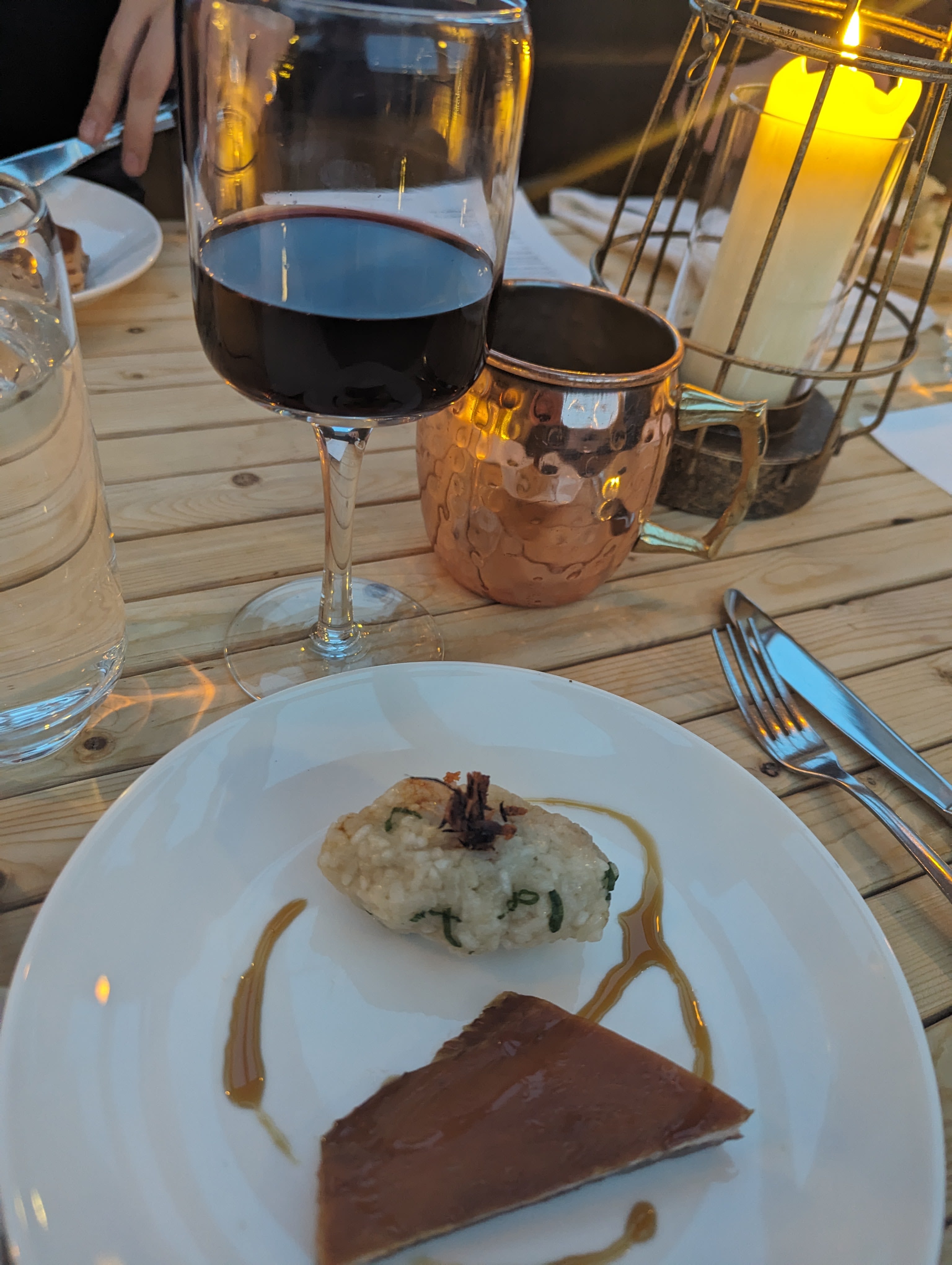 As evening settles in, we are served the fourth course — a delicious take on the 'Northern Lights' theme, a tease of the spectacle we are hoping to see outdoors shortly.