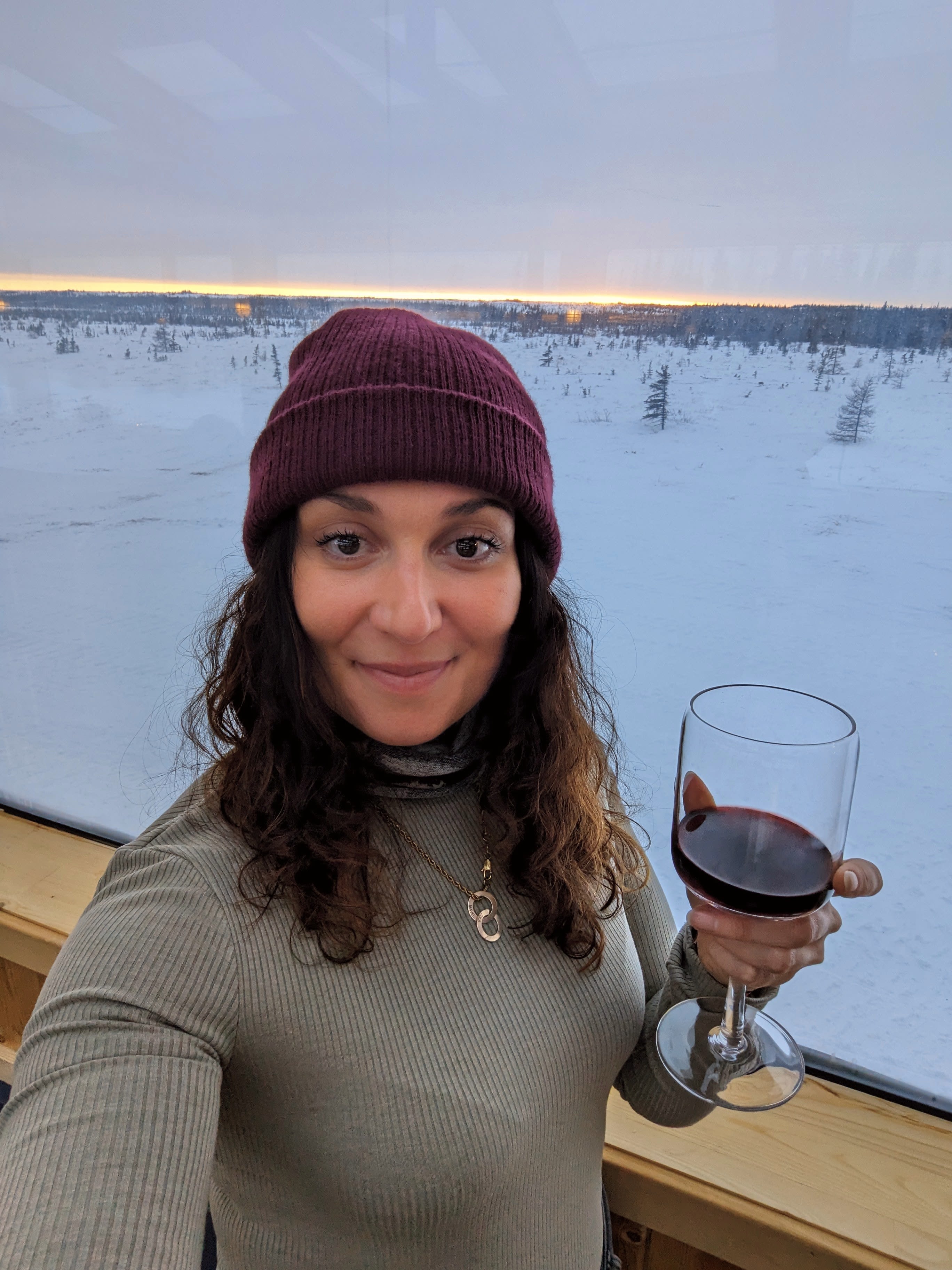 The evening begins with a sunset that stretches across the uninterrupted horizon, painting the white tundra red with its glow. I gaze out at the mesmerizing sight, wine in hand. Even though the sky is cloudy, the sun still impresses.